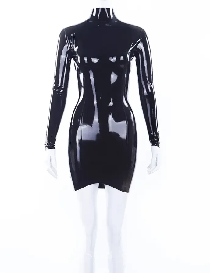 Black Long Sleeves High Collar Back Zip Latex Mini Dress