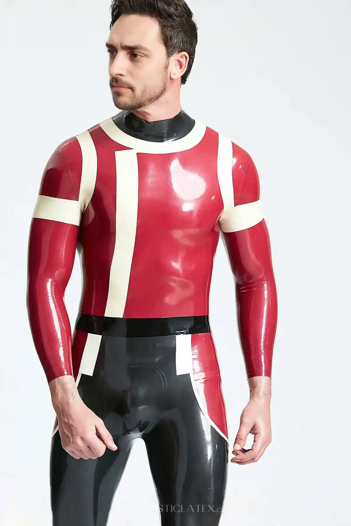 • Supply Male Black and Red Trim Star Pattern Latex Catsuit